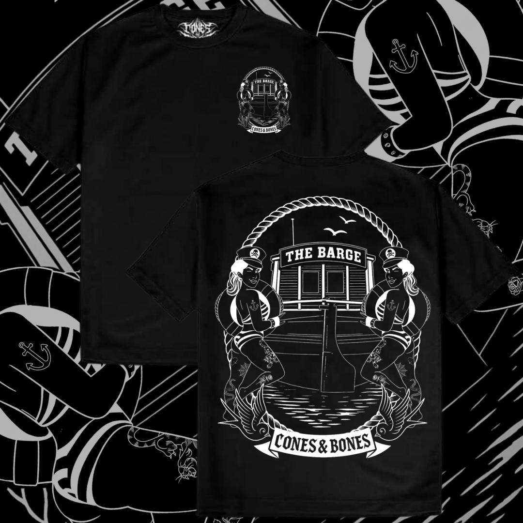 Printed on a black 100% heavy cotton t-shirt. The back print features the iconic Barge in all her glory, flanked by the classic Barge pin-up girl and surrounded by sea-inspired artwork.